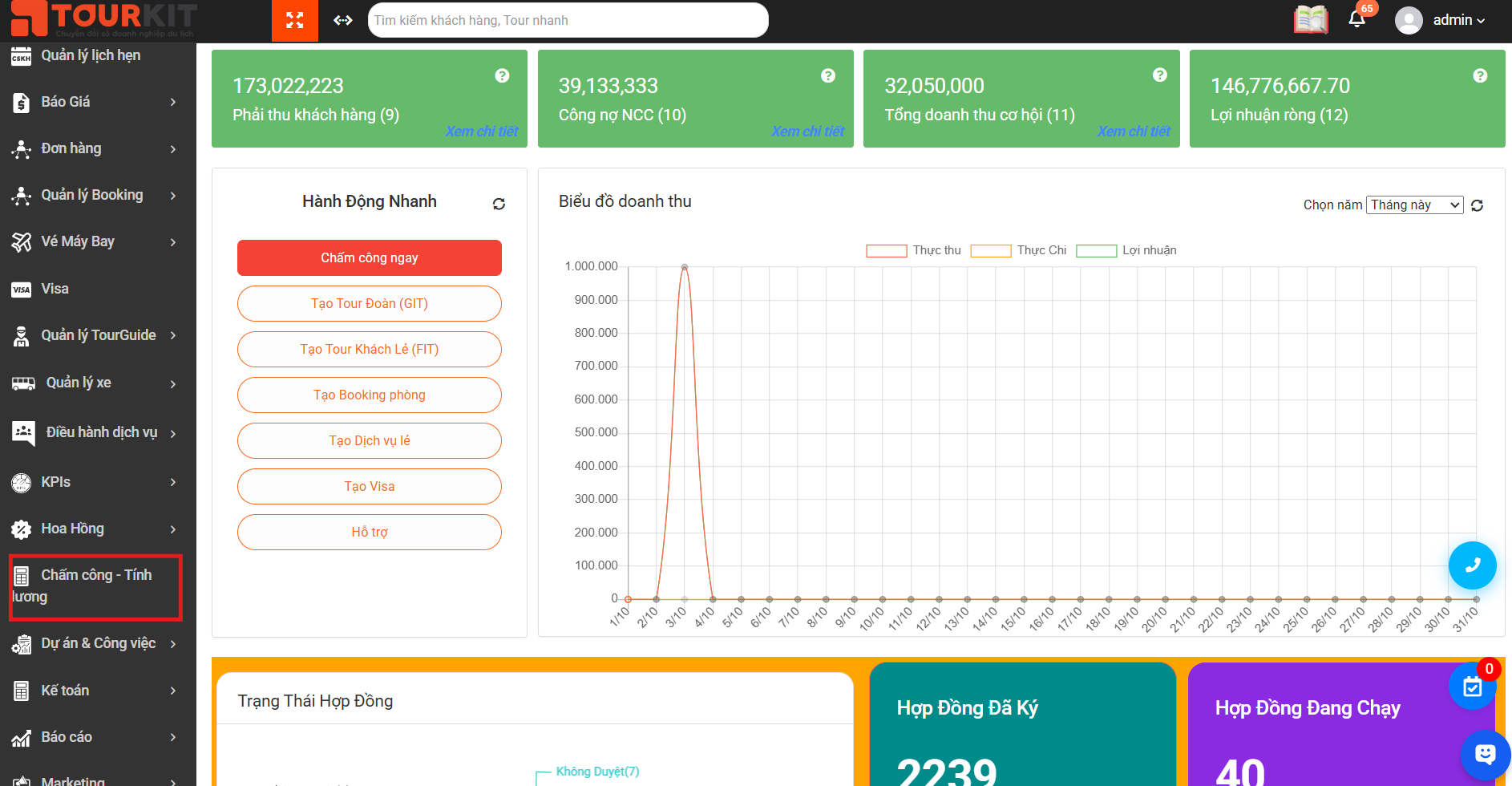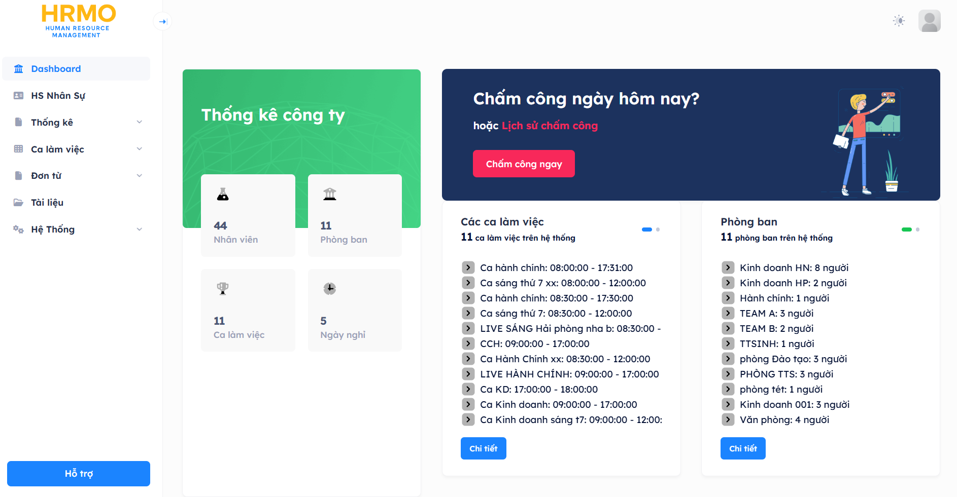 Với tk nhân viên chỉ hiển thị chức năng chấm công ngay ( cần liên hệ với admin để được phân quyền)