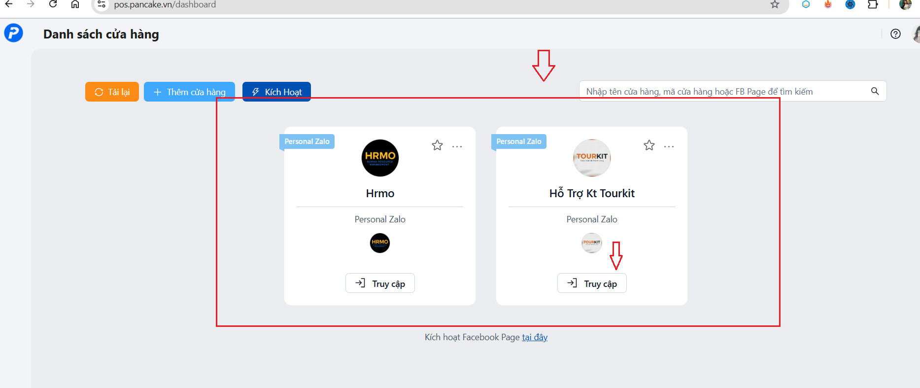 Bước 1: Truy cập mục POS trên Pancake: https://pos.pancake.vn/dashboard sau đó chọn Page bạn muốn tích hợp (Cần kích hoạt trước)