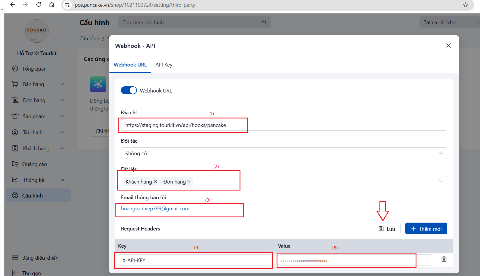 Bước 5: Vào tab: webhook URL điền các giá trị như sau: