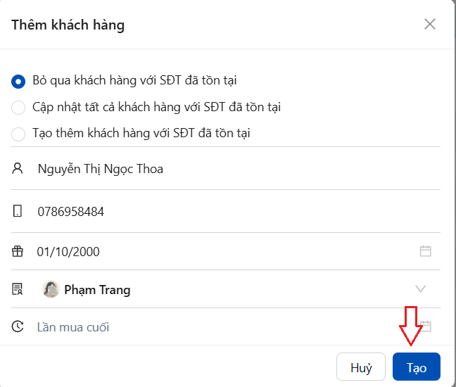 Lưu ý: đối với KH đã có Số điện thoại trên hệ thống => không cập nhật lại dữ liệu