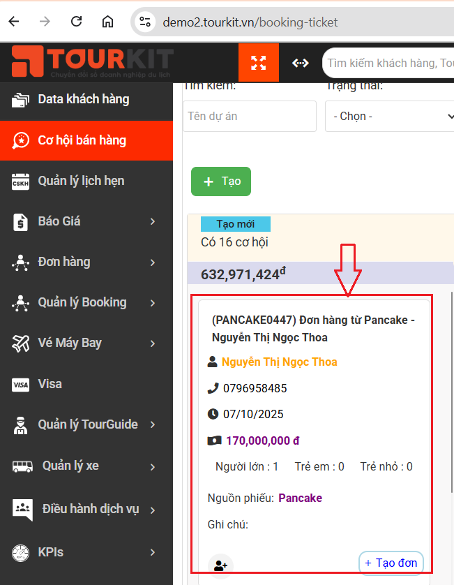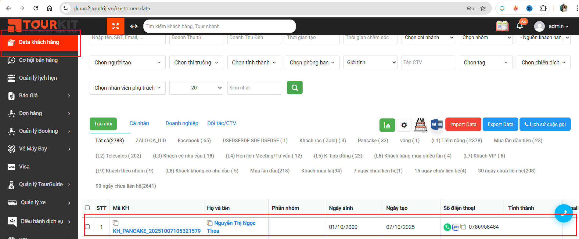 Bước 4: Truy cập Tourkit VD: https://demo2.tourkit.vn/login => Vào Data KH: Dữ liệu vừa tạo trên Pancake sẽ vào mục Data KH