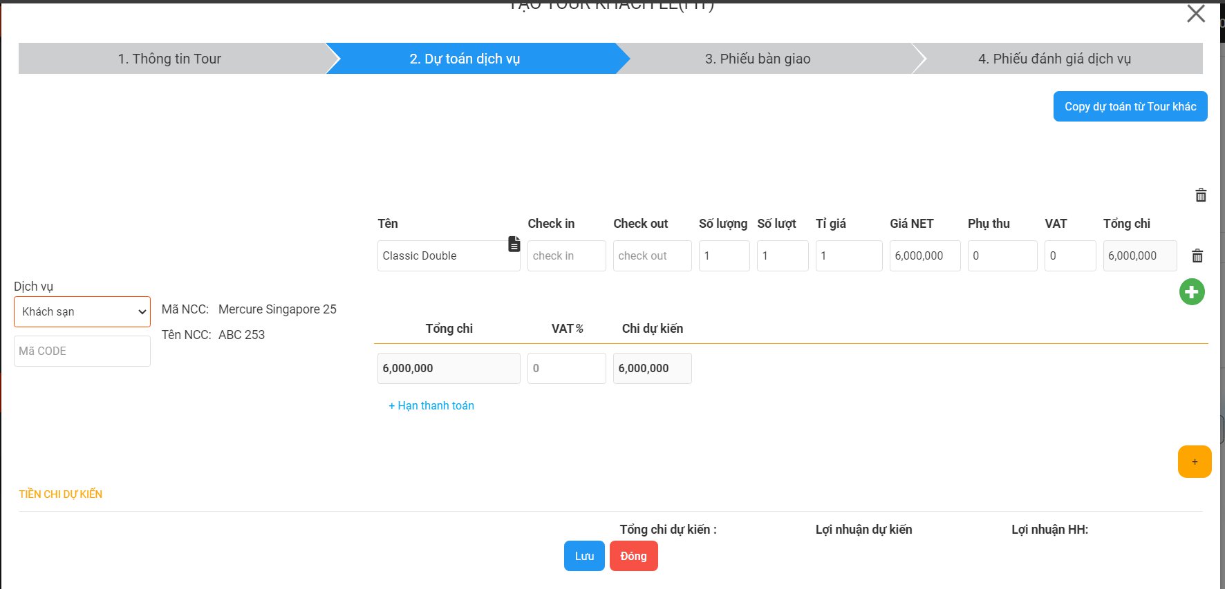 | Coppy dự toán | Bắt buộc chọn 1 tour từ các tour đã có sẵn để coppy dự toán. |