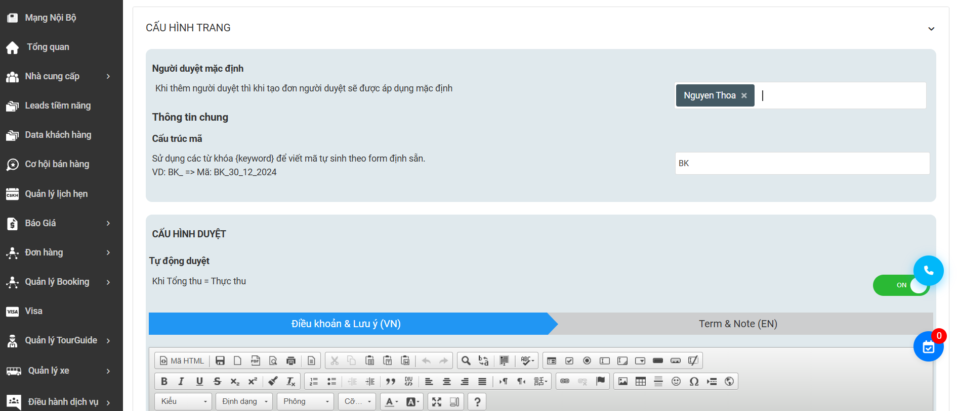 Điều khoản & Lưu ý Nội dung được tạo ở khu vực Điều khoản & Lưu ý này sẽ được bắt tự động cho toàn bộ tất cả các Tour được tạo ra ở phần Tạo mới