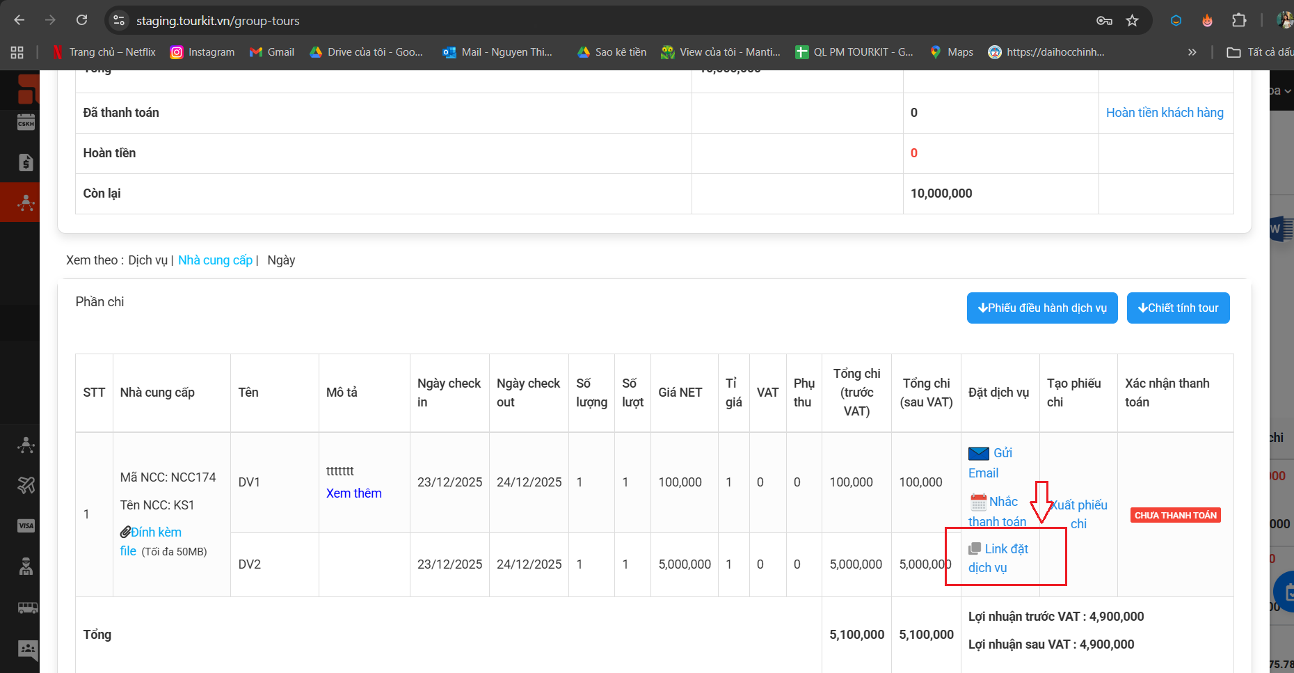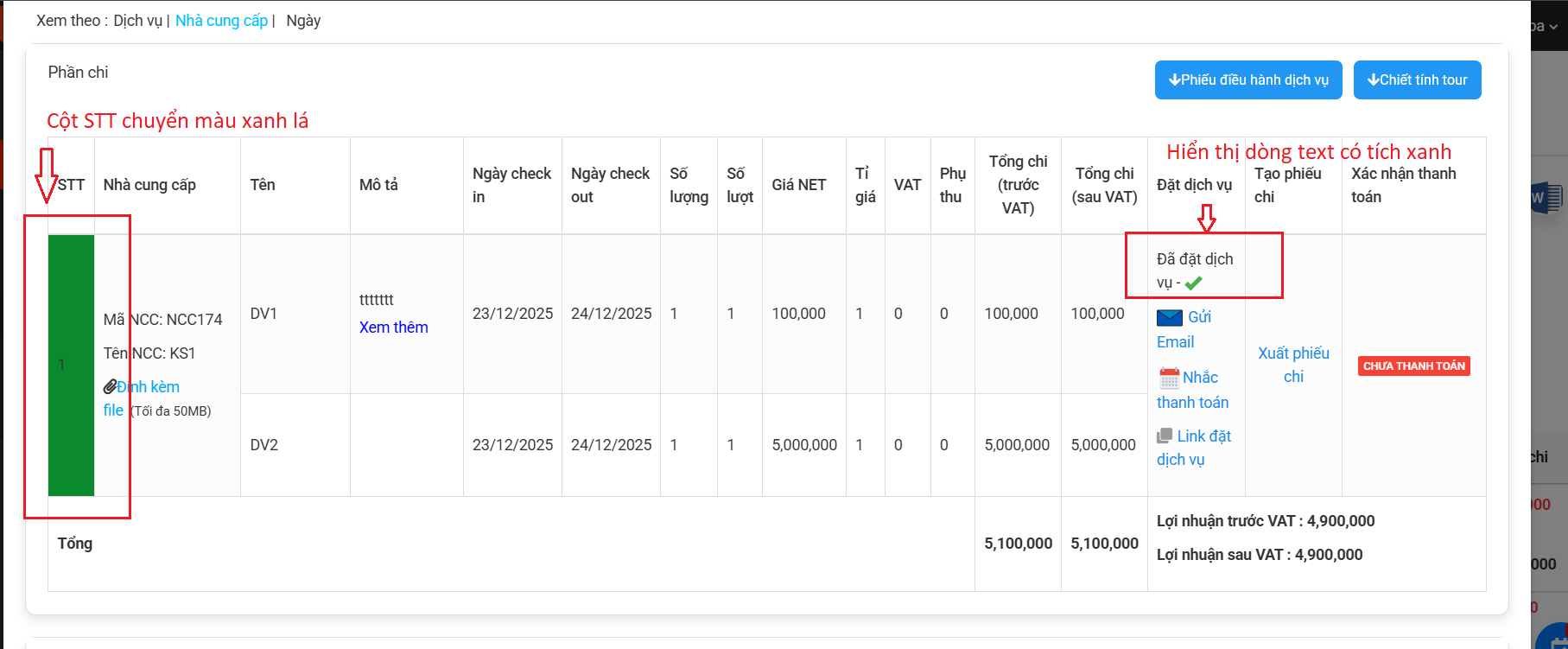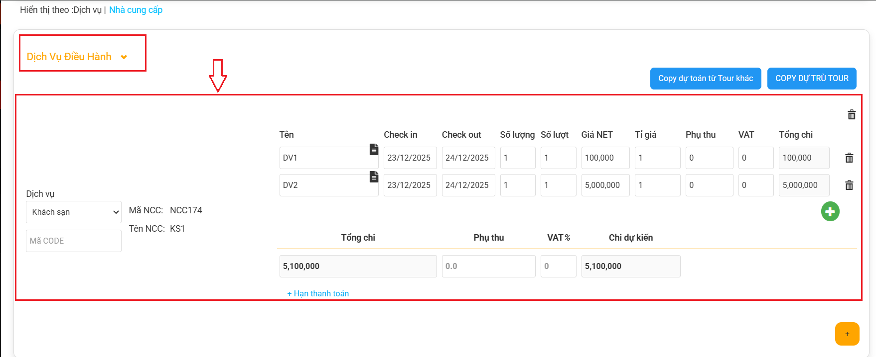 tại mục Dịch vụ điều hành => chọn dịch vụ NCC bất kỳ :