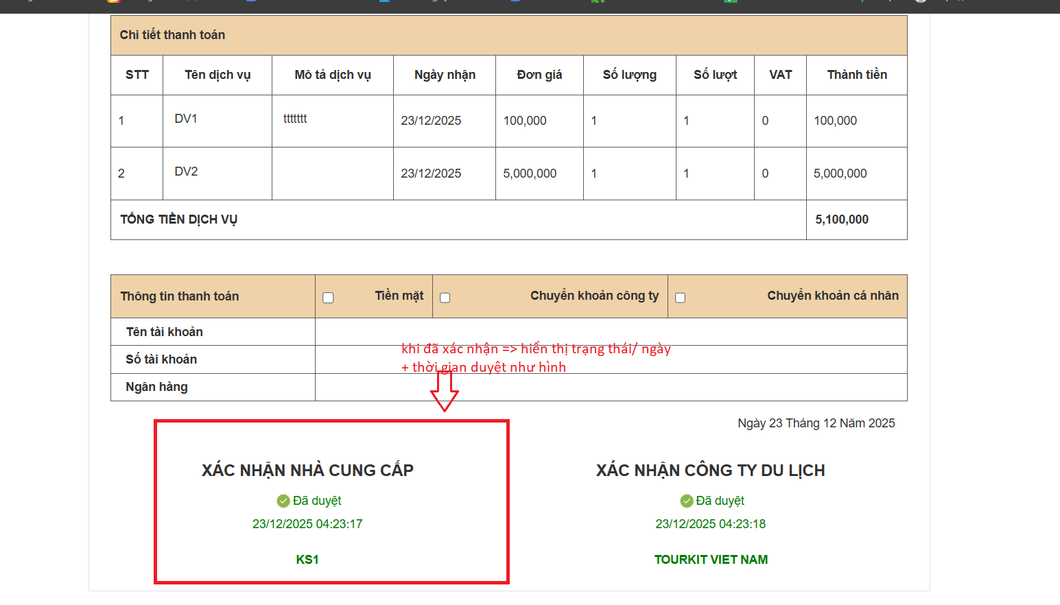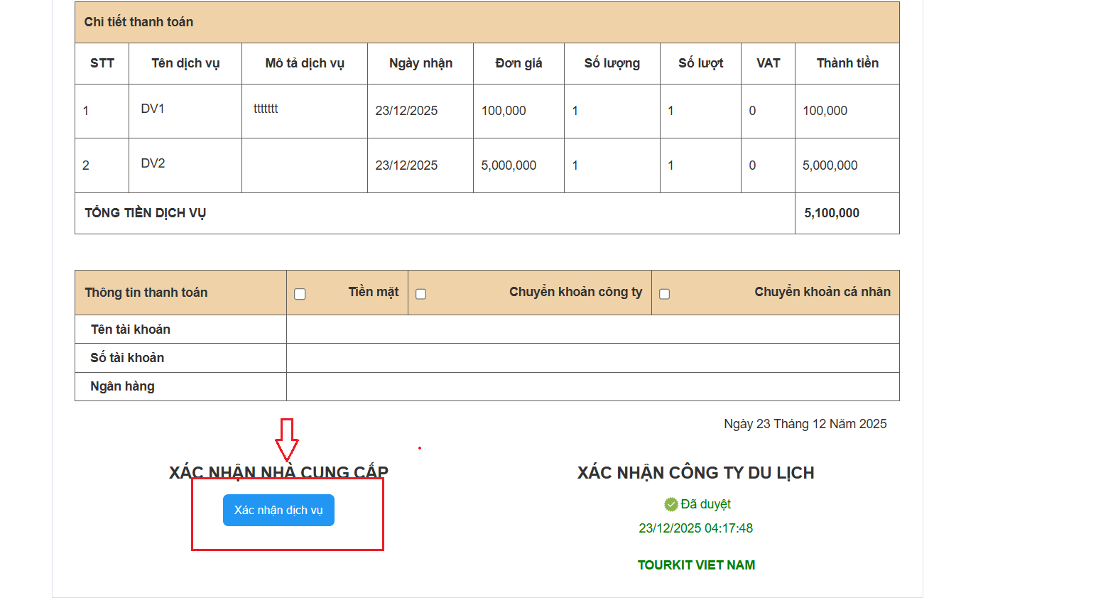 Bước 4 : Nhà cung cấp click nút Xác nhận dịch vụ để xác nhận/kí