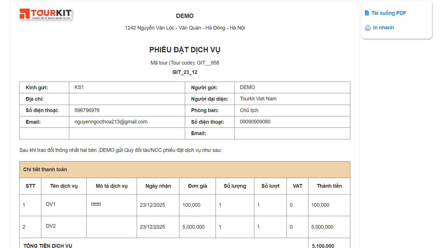 Bước 3: Nhà cung cấp Click vào Link ⇒ Hiển thị Trang “Phiếu đặt dịch vụ” (không cần có tài khoản đăng nhập)