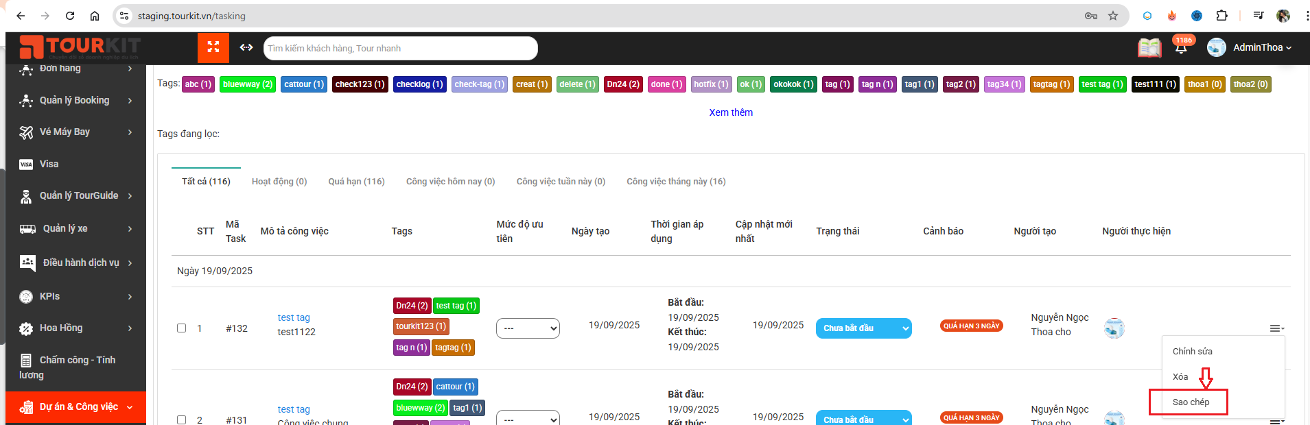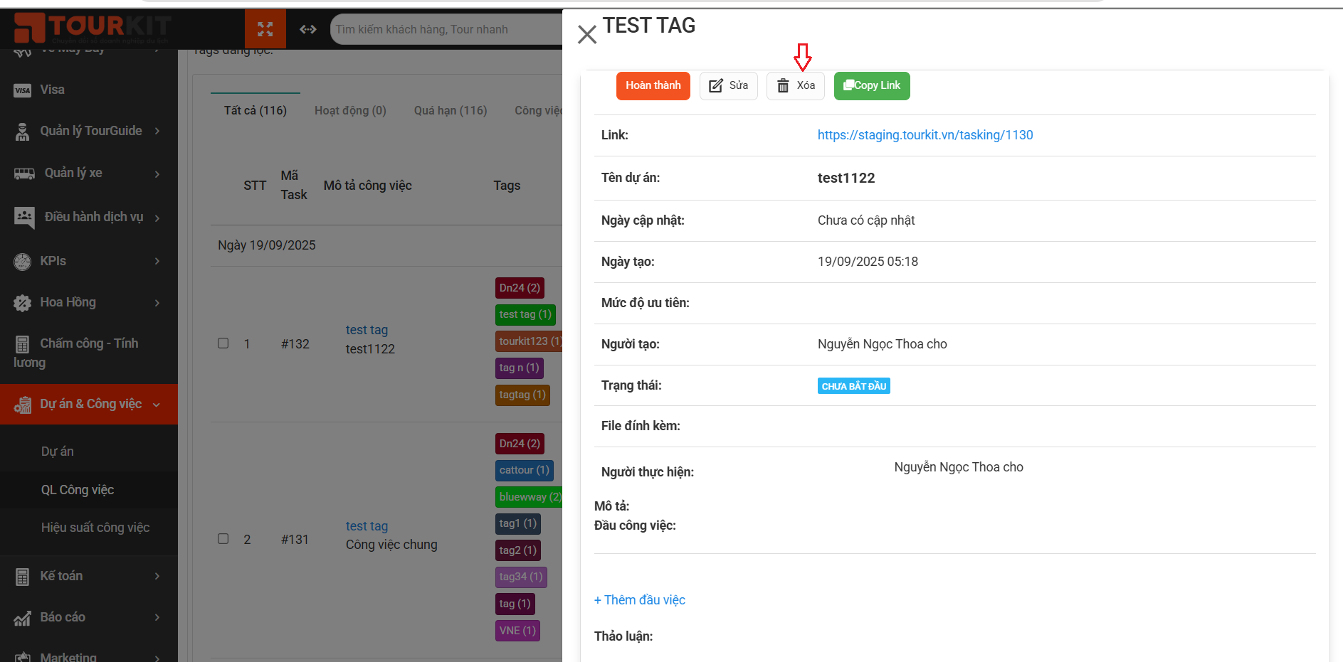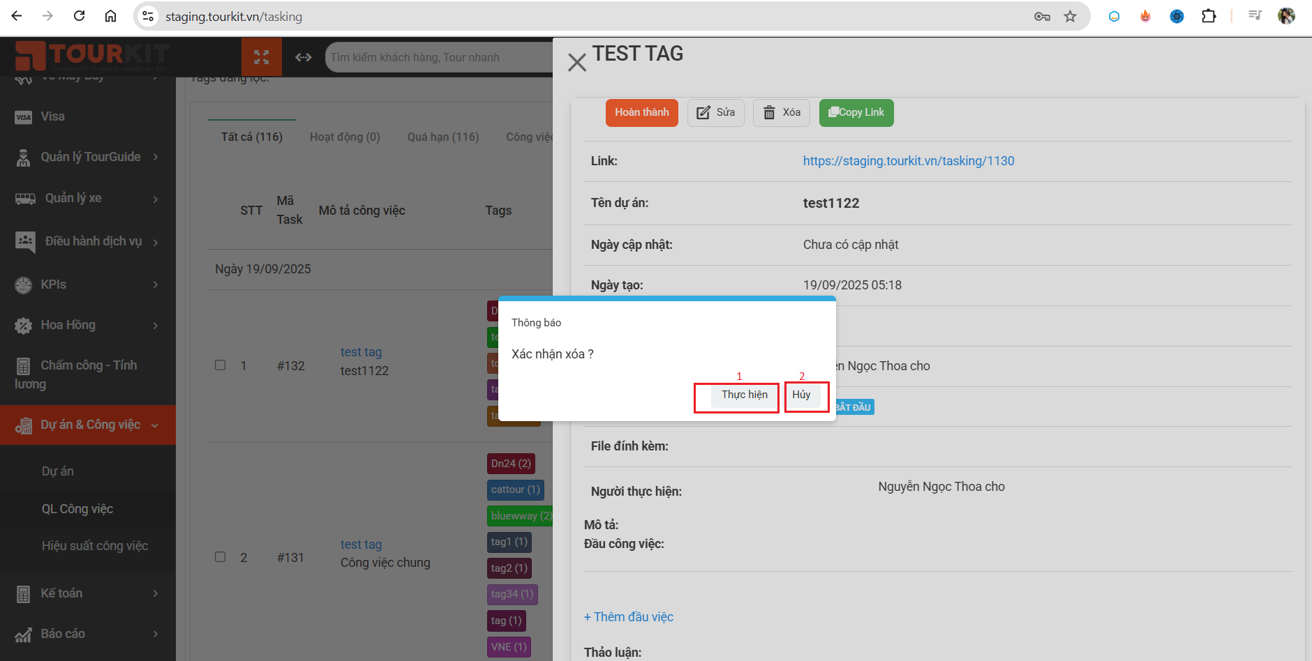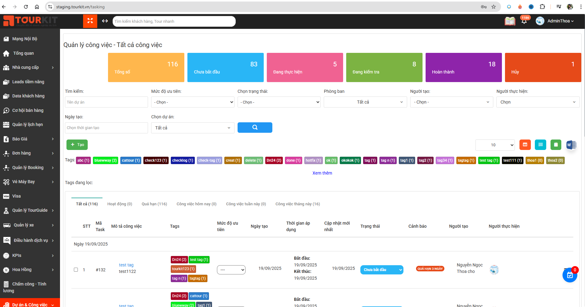 Module Quản lý công việc giúp theo dõi, phân loại và giám sát tiến độ các nhiệm vụ theo trạng thái, ưu tiên, dự án và người thực hiện. Người dùng có thể tạo mới, gắn tag, lọc tìm kiếm và kiểm soát hạn xử lý để đảm bảo công việc được thực hiện đúng kế hoạch.