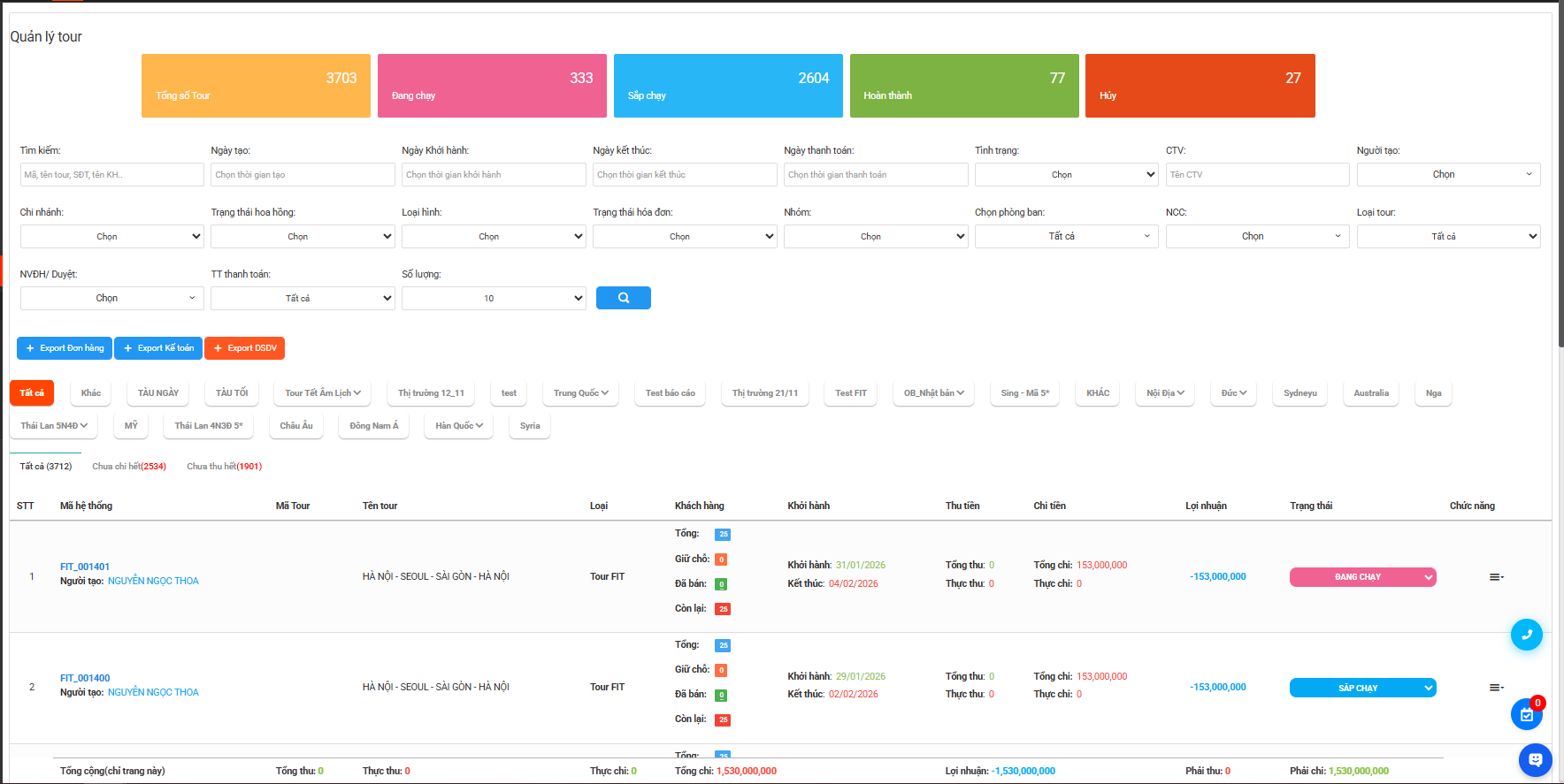 | Chưa thu hết | Bộ đếm + lọc tất cả các tour chưa thu hết |
