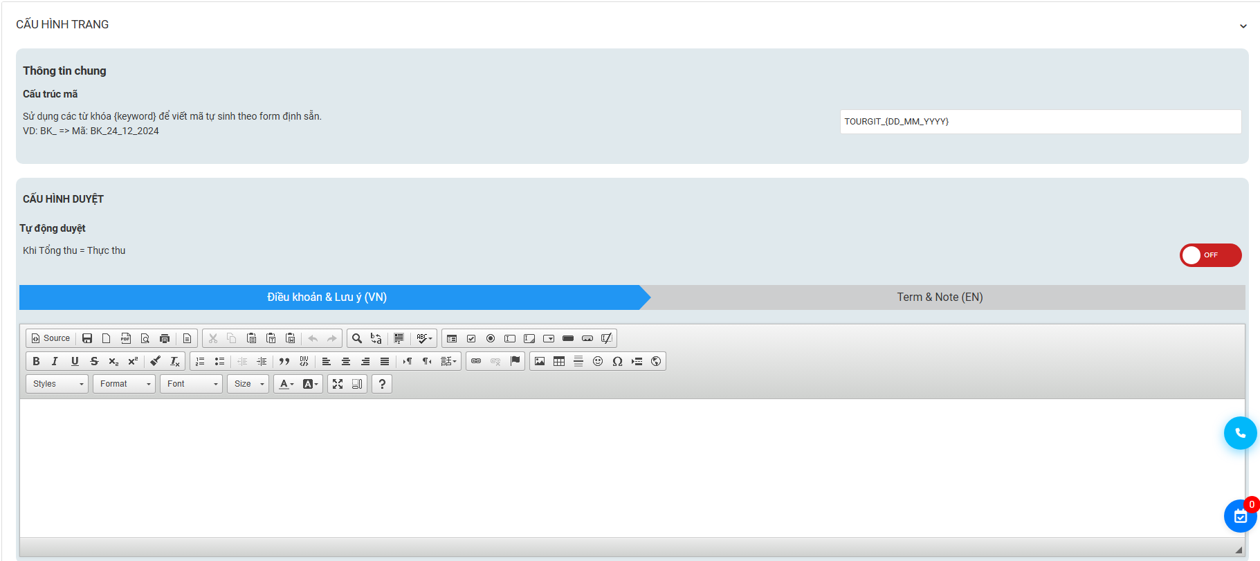 | Mã phiếu thu | Bắt theo cấu hình "Mã tour_No.1". |